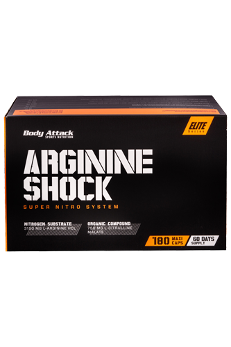 - Body Attack Arginine Shock stellt für den erhöhten Proteinstoffwechsel während einer anstrengenden Sport- und Definitionsphase eine Menge von 3150 mg L-Arginin Hydrochlorid und 750 mg L-Citrullin-Malat bereit.